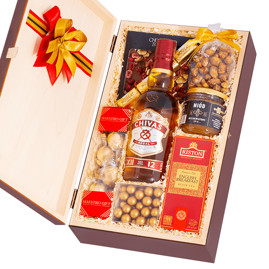 Zestaw Madison to elegancki zestaw prezentowy premium,łączący klasyczny smak ze słodkimi i aromatycznymi dodatkami. W jego skład wchodzi herbata English Breakfast, miód wielokwiatowy, praliny, czekolady oraz orzechy w karmelu, które tworzą harmonijną kompozycję. To doskonały prezent dla konesera dobrego smaku, idealny na każdą wyjątkową okazję.