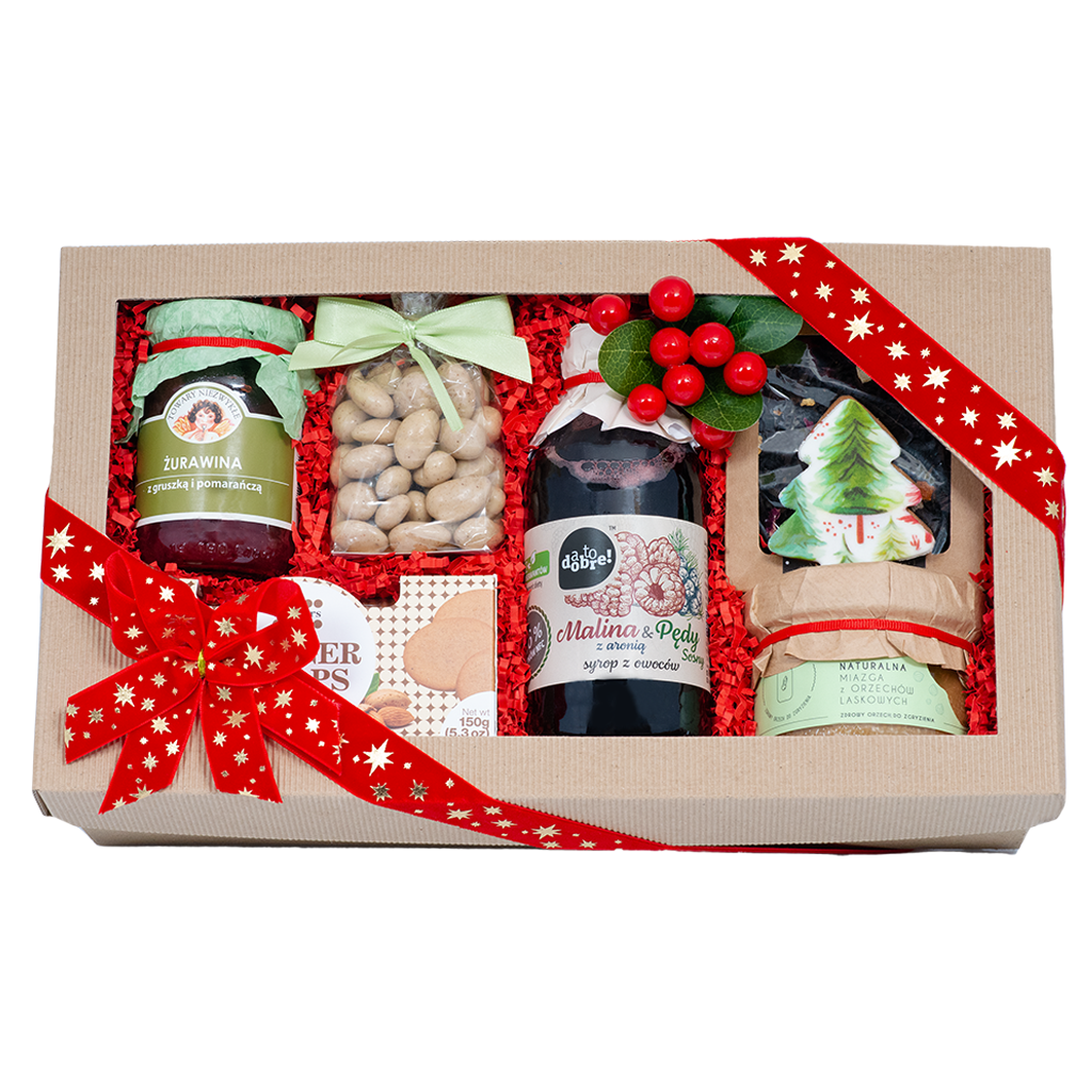 Zestaw Adwent to wyjątkowa kompozycja zimowych smaków – aromatycznych konfitur, słodkości i rozgrzewających dodatków idealnych na czas oczekiwania na święta. W środku znajdziesz syrop malinowy z aronią, piernik, herbatę, orzechy i migdały w białej czekoladzie. To doskonały świąteczny zestaw prezentowy bez alkoholu, który wprowadza w magiczny klimat Bożego Narodzenia i zachwyca smakiem tradycji.