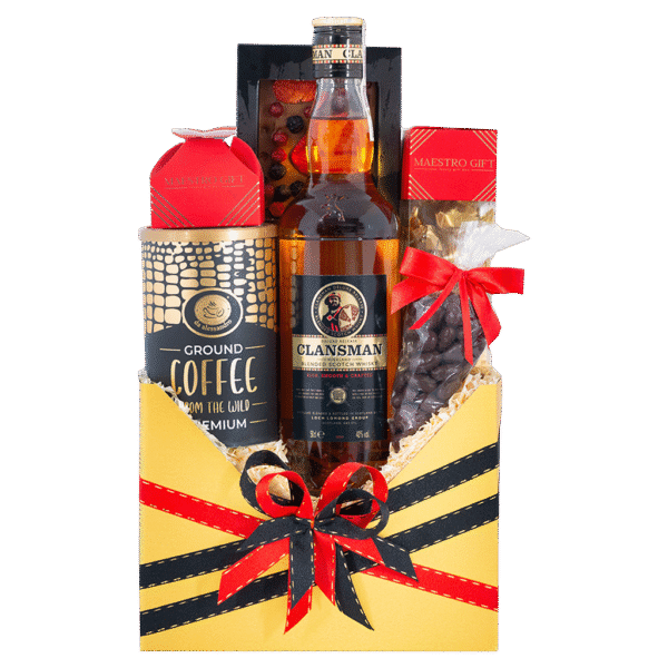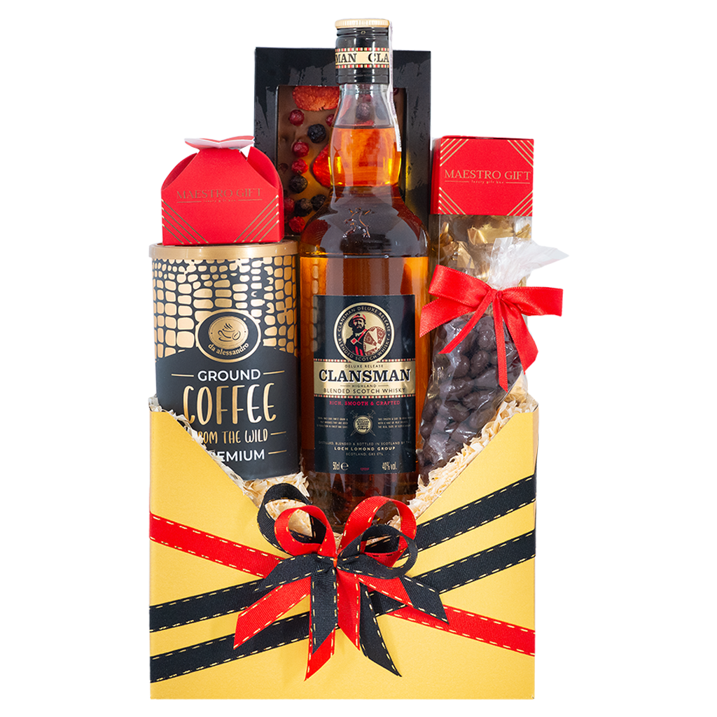 Zestaw Boston to elegancki zestaw prezentowyłączący klasyczny smak szkockiej tradycji z wykwintnymi słodyczami i aromatyczną kawą arabika. W środku znajduje się ręcznie wyrabiana czekolada z owocami, praliny, żurawina w czekoladzie oraz cukierki truflowe, które tworzą wyjątkową kompozycję. To idealny prezent dla koneserów dobrego smaku i miłośników słodkich, eleganckich upominków.