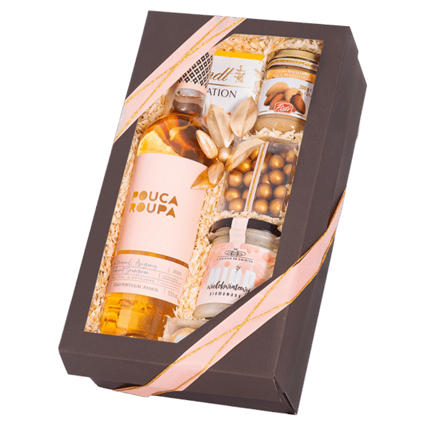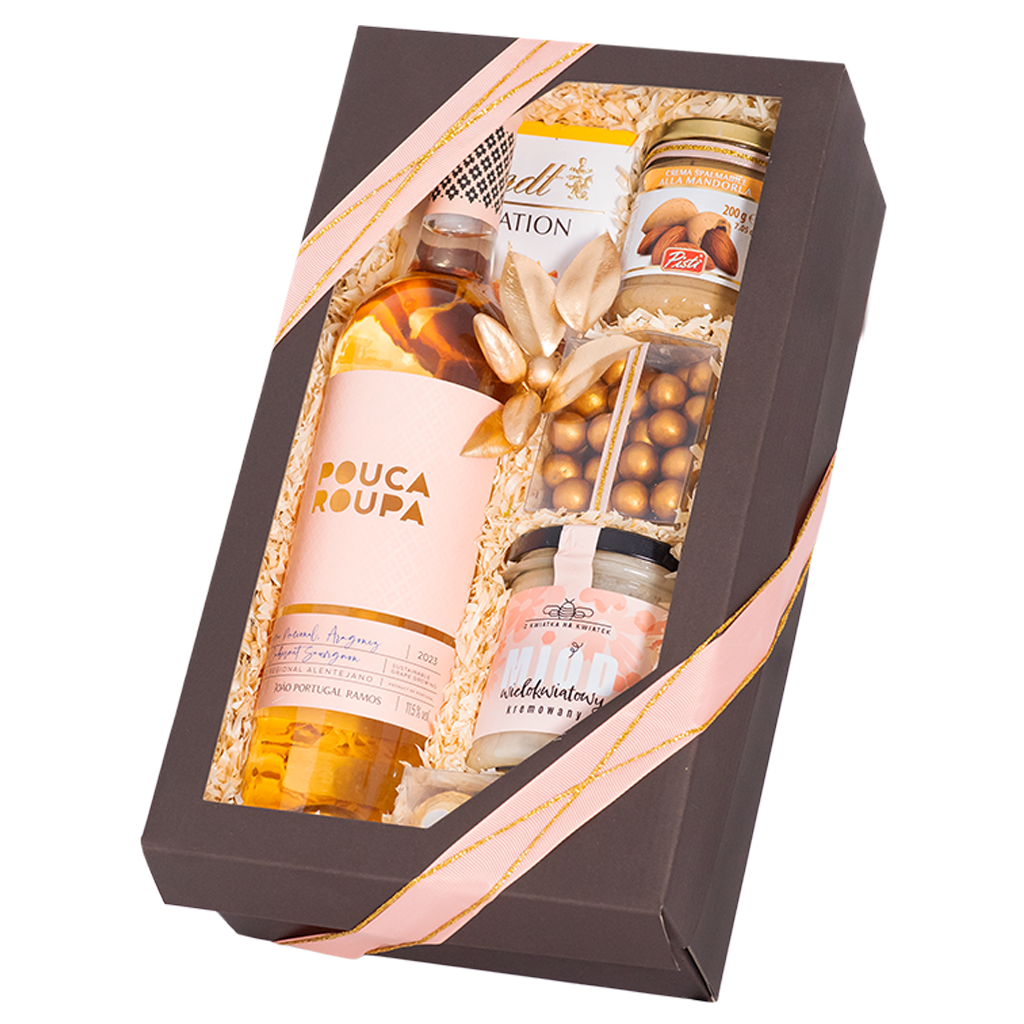 Zestaw Carioca to eleganckie połączenie portugalskiego wina różowego Pouca Roupa z wykwintnymi słodkościami i miodem kremowanym. W środku znajdziesz czekolady, delikatny krem migdałowy, chrupiące perełki w mlecznej czekoladzie oraz kultowe praliny Ferrero Rocher. To doskonały zestaw prezentowy z winem, idealny dla osób ceniących harmonię smaku i odrobinę luksusu.