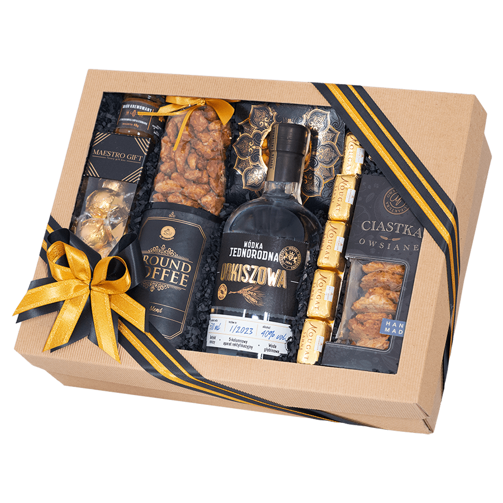 Zestaw Charleston to eleganckie połączenie wódki Jednorodnej orkiszowej z wyselekcjonowanymi słodyczami, aromatyczną kawą i naturalnym miodem. W pudełku znajdują się praliny, czekoladki, ciastka owsiane z malinami oraz orzechy w karmelu – idealne na prezent lub chwilę relaksu. To doskonały zestaw prezentowy z wódką, któryłączy tradycję, wysoką jakość i wyjątkowy smak.