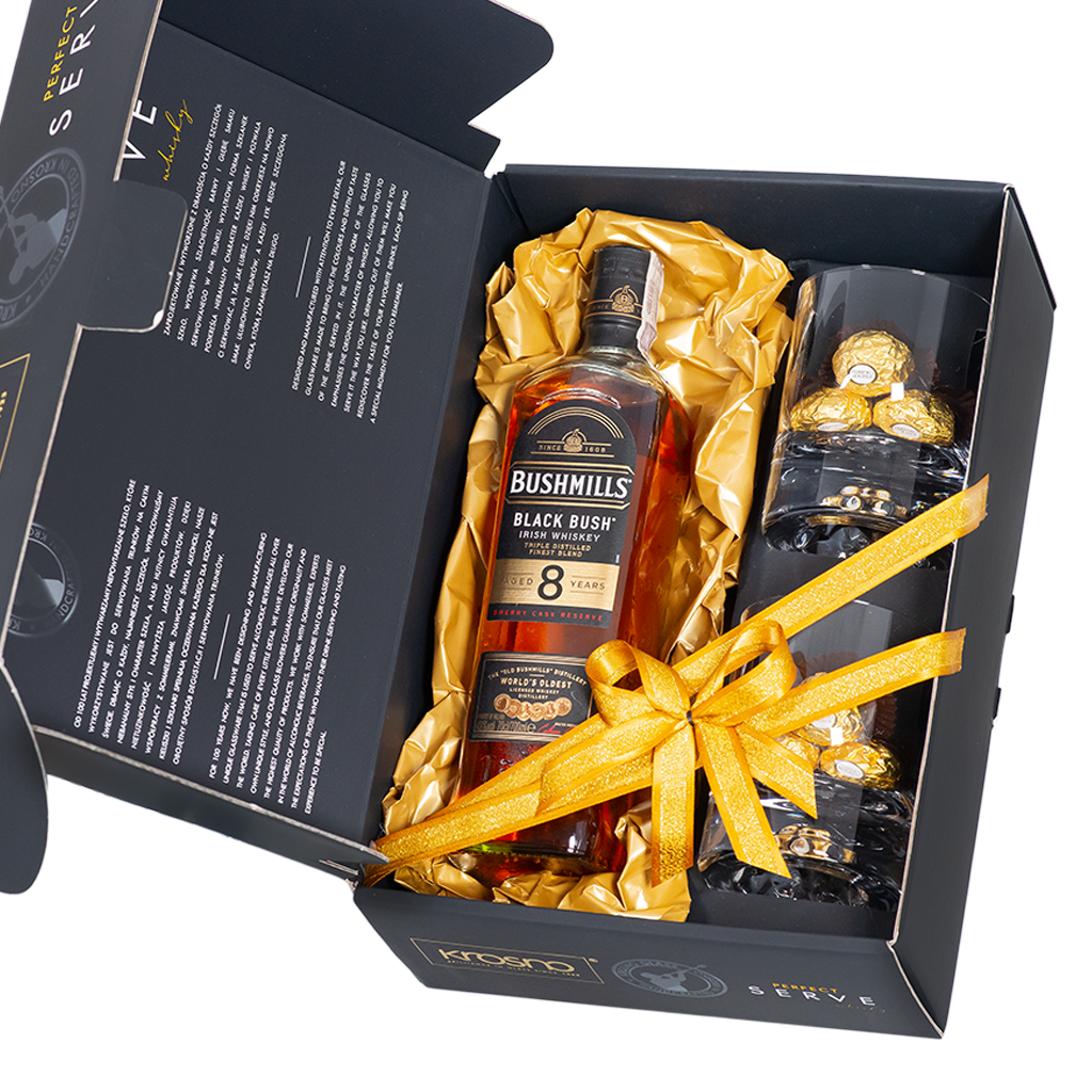 Zestaw Gawot to stylowe połączenie irlandzkiej whiskey Bushmills Black Bush8 Years z klasycznymi pralinami Ferrero Rocher i eleganckimi szklankami Krosno. To doskonały pomysł na prezent dla konesera wyjątkowych trunków i dobrego smaku. Ten zestaw prezentowy z whiskeyłączy tradycję, elegancję i ponadczasowy charakter.