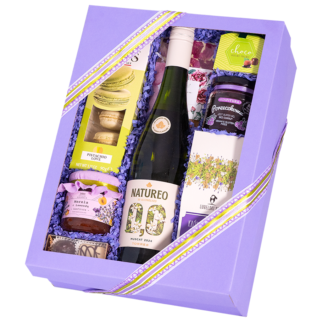 Zestaw JOTA to elegancki kosz delikatesowyłączący wyjątkowe smaki — od hiszpańskiego bezalkoholowego wina Natureo Muscat, po ręcznie wyrabiane czekoladki i praliny. W środku znajdziesz także naturalne konfitury, krówki lubelskie ze śliwką oraz ciastka z kremem pistacjowym, które tworzą harmonijną kompozycję smaków. To doskonały pomysł na prezent dla koneserów słodyczy i dobrego smaku.