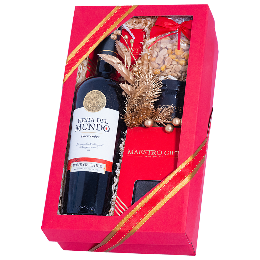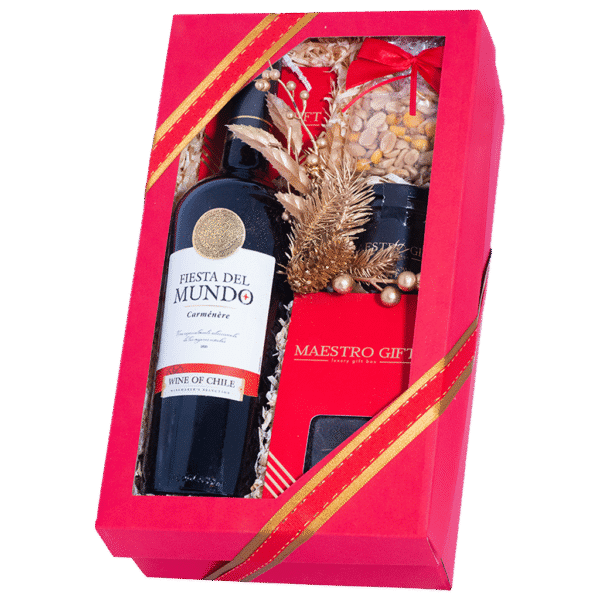 Zestaw Maestro Gift to eleganckie połączenie chilijskiego wina Fiesta del Mundo Carmenere z wykwintnymi słodkościami. W środku znajduje się konfitura z owoców z winem Sangria, brazylijska kawa, praliny waniliowe oraz orzechy w karmelu. To doskonały wybór na prezent, któryłączy smak, aromat i elegancję w jednym.