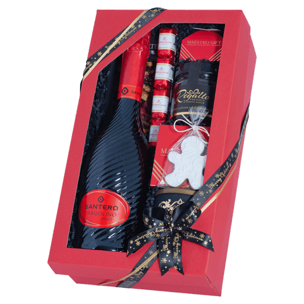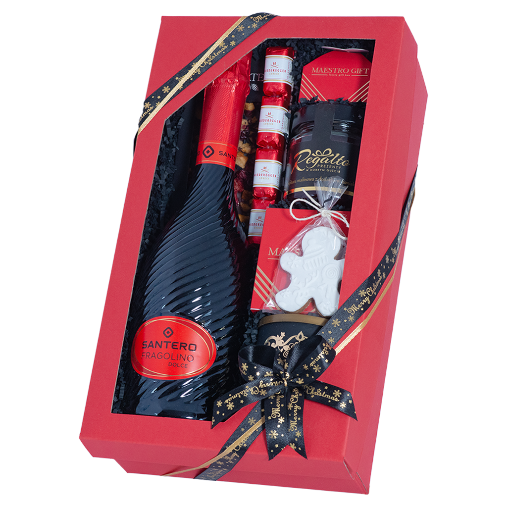 Zestaw Nowy Rok to wyjątkowy prezent sylwestrowyłączący włoskie wino musujące Santero Fragolino Dolce z aromatyczną kawą arabika i wykwintnymi słodyczami. W środku znajduje się konfitura malinowa z rumem, praliny, czekolady oraz piernik, które tworzą doskonałą kompozycję smaków. To idealny zestaw prezentowy na Nowy Rok dla osób ceniących elegancję, słodycz i świąteczny nastrój.