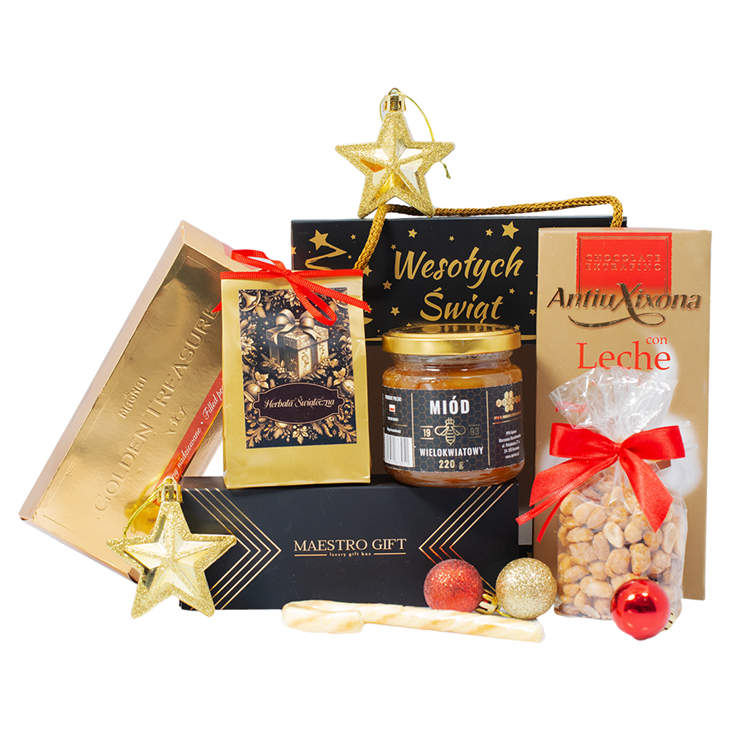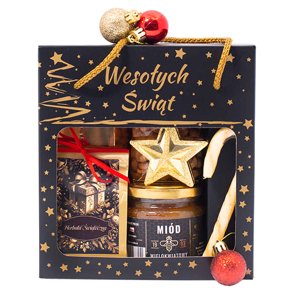 Zestaw Od Mikołaja to uroczy prezent świąteczny pełen słodkich i aromatycznych niespodzianek. W środku znajduje się miód wielokwiatowy, herbata korzenna, praliny i czekolada mleczna, które tworzą przytulną kompozycję zimowych smaków. To idealny zestaw upominkowy na Boże Narodzenie dla bliskich, którzy cenią domowe ciepło i odrobinę słodyczy.