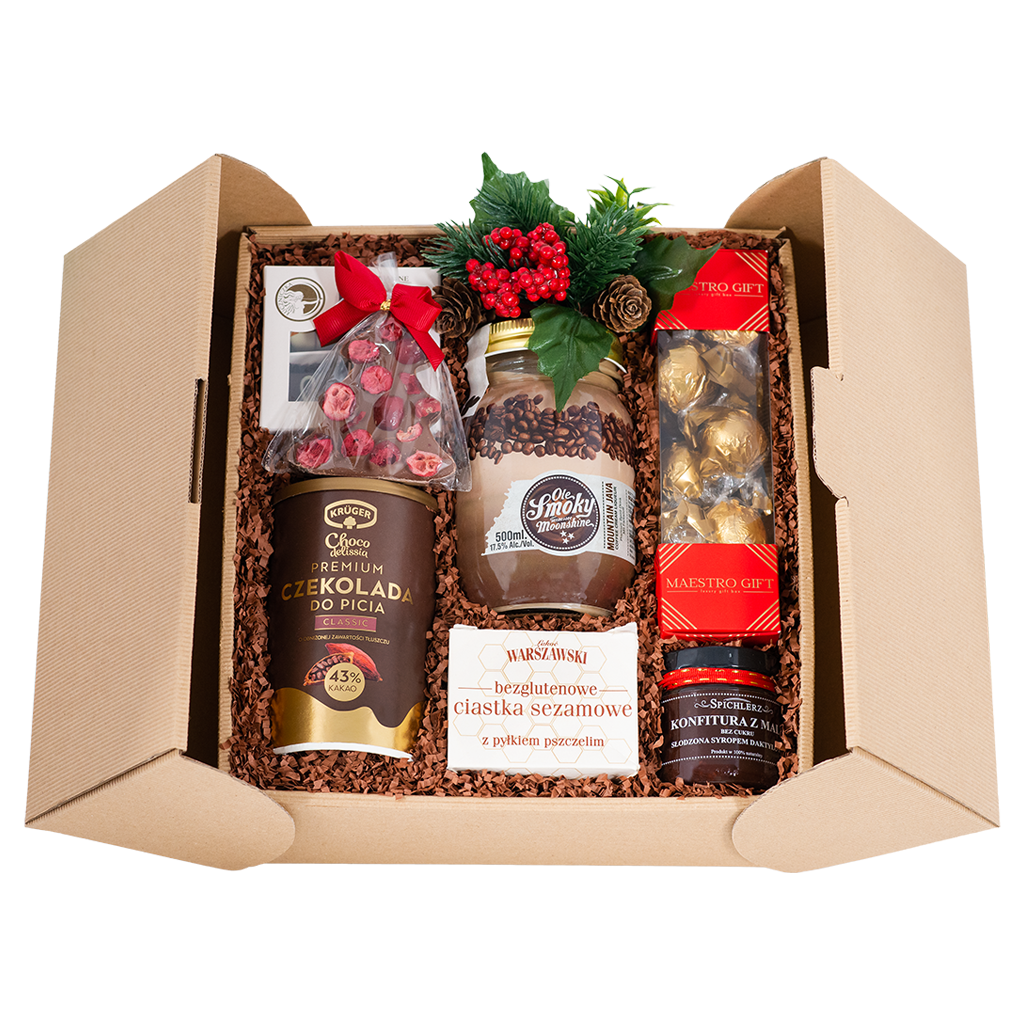 Zestaw Pasterka to harmonijne połączenie likieru kawowo‑śmietankowego Moonshine Ole Smoky Mountain Java z wybornymi słodyczami i aromatycznymi dodatkami. W eleganckim opakowaniu znajdziesz praliny, konfiturę malinową, czekoladę do picia oraz kruche ciastka – idealny upominek na świąteczne wieczory. To wyjątkowy zestaw prezentowy z likierem kawowym, który wprowadzi ciepły nastrój i umili zimowe chwile.