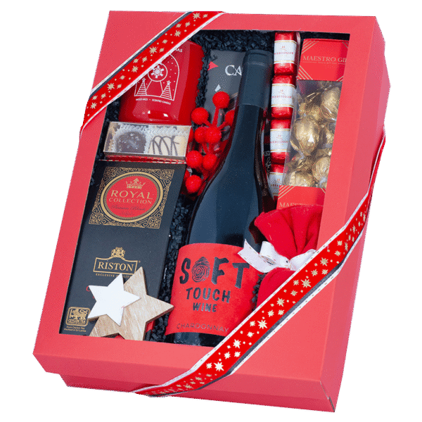 Zestaw PierwszaGwiazdka to eleganckie połączenie francuskiego wina SoftTouchChardonnay z aromatyczną herbatą i wykwintnymi słodyczami. W środku znajdują się praliny, czekolady, orzechy laskowe oraz sojowa świeca zapachowa, tworzące ciepły, świąteczny nastrój. To idealny świąteczny zestaw prezentowy z winem, który łączy subtelność smaku z magią Bożego Narodzenia.