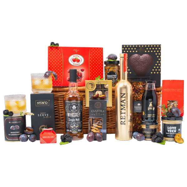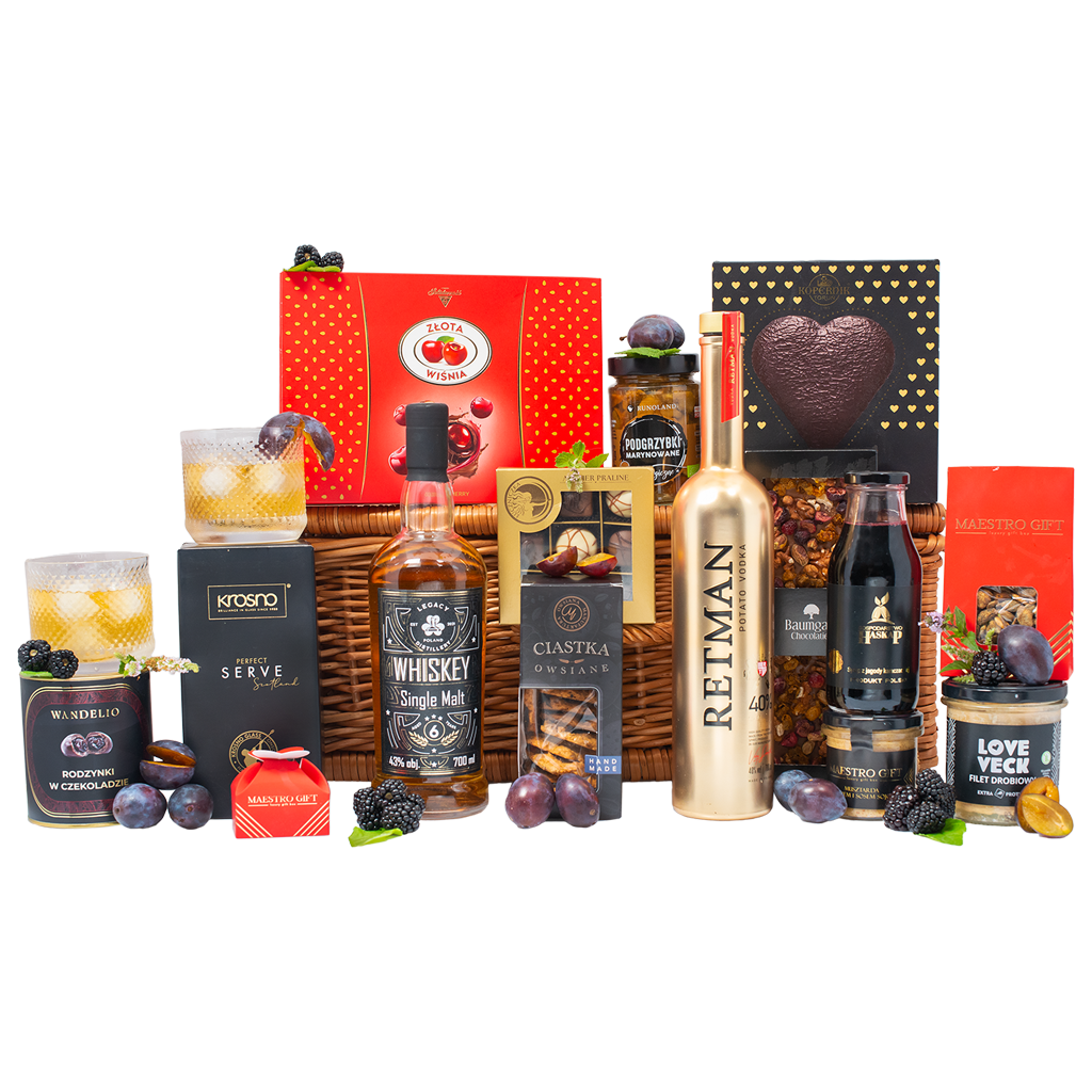 Zestaw Polonez to wyjątkowa kompozycja polskich smaków i aromatów w eleganckiej oprawie. W jego skład wchodzą wódka Retman Potato, polska whisky single malt, wykwintne czekoladki z wiśniami w likierze, a także regionalne przysmaki – mięsiwo, grzybki i musztarda z sezamem. Całość dopełniają słodkie dodatki i stylowe szklanki do whisky, tworząc gustowny prezent dla koneserów tradycji i jakości.