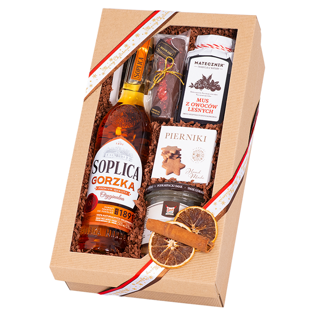 Zestaw Świąteczny Piernik to wyjątkowe połączenie klasycznej wódki Soplica Gorzka Oryginalna z tradycyjnymi przysmakami i aromatycznymi dodatkami. W eleganckim opakowaniu znajdują się ręcznie robione pierniki, mięsny specjał w słoju, mus owocowy oraz susz do przygotowania grzańca. To idealny świąteczny zestaw prezentowy z nutą tradycji, który zachwyci smakiem i ciepłym, bożonarodzeniowym klimatem.