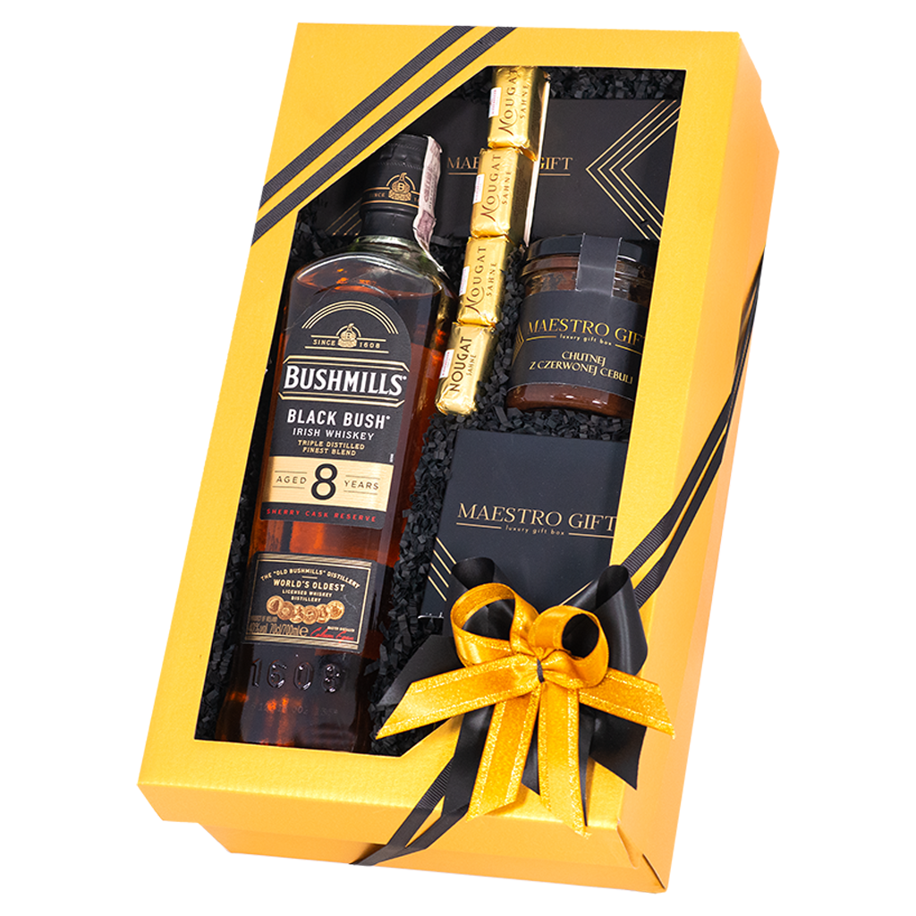 Zestaw Totur to elegancki zestaw prezentowy premium, stworzony z myślą o koneserach dobrego smaku. W jego skład wchodzi irlandzka whiskey Bushmills Black Bush, aromatyczna brazylijska kawa, wykwintny chutney z czerwonej cebuli oraz delikatne praliny i czekoladki. To idealny prezent dla mężczyzny lub miłośnika wyjątkowych smakowych doznań.