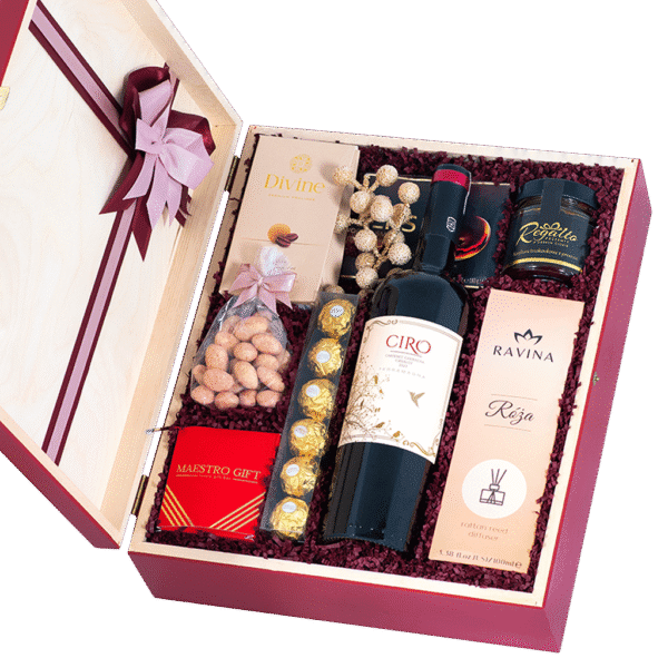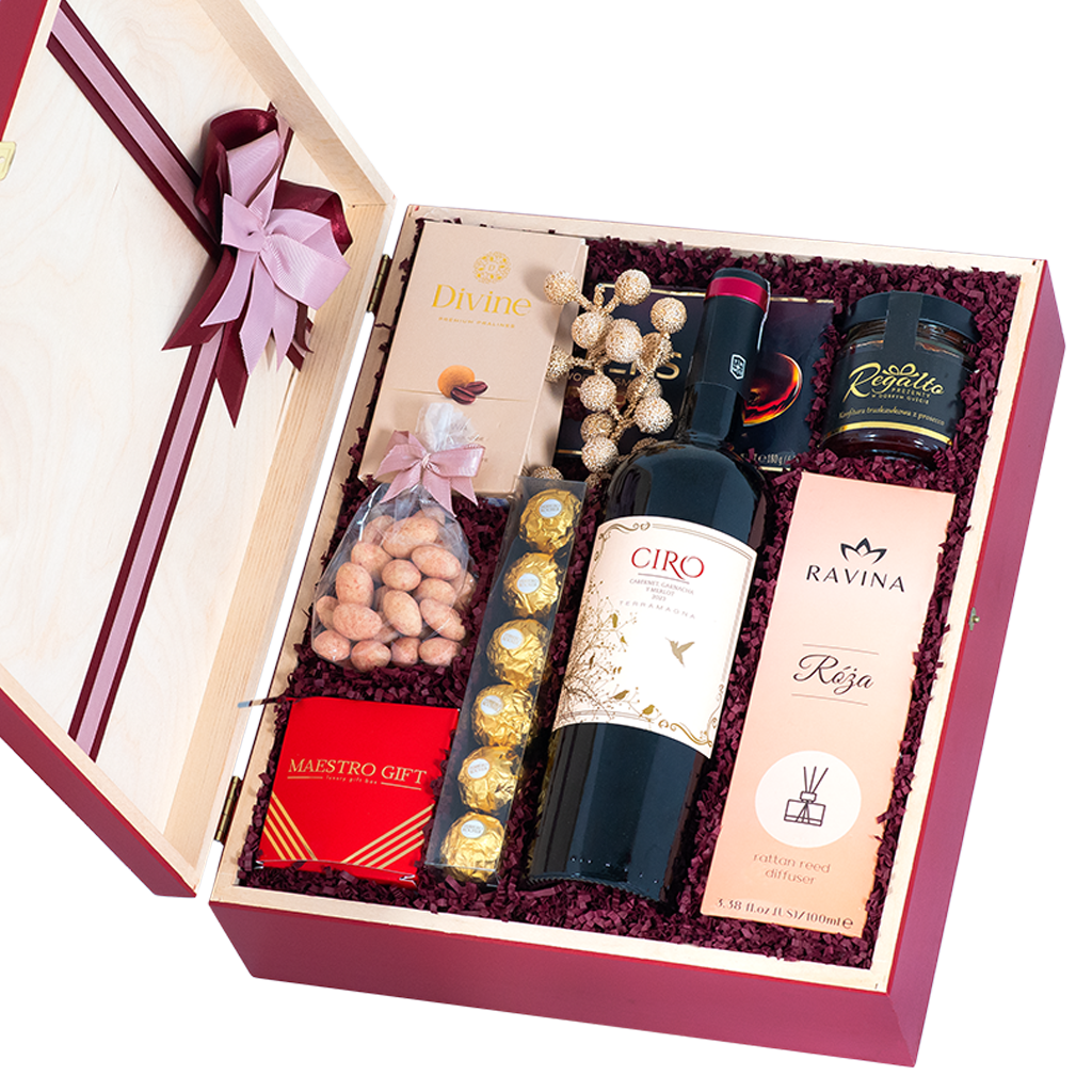 Zestaw Twist to wyjątkowe połączenie hiszpańskiego wina Ciro Cabernet Garnacha Y Merlot z eleganckimi słodkościami i aromatycznym dodatkiem do wnętrz. W środku znajduje się konfitura z winem Sangria, praliny, likwory o smaku brandy, migdały i ziarna kawy w białej czekoladzie oraz kultowe czekoladki Ferrero Rocher. Całość dopełnia stylowy dyfuzor zapachowy, tworząc zestaw idealny na prezent dla koneserów dobrego smaku i elegancji.