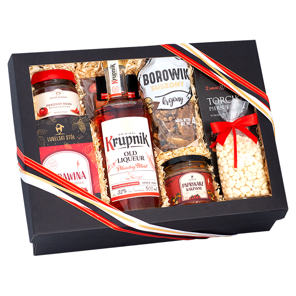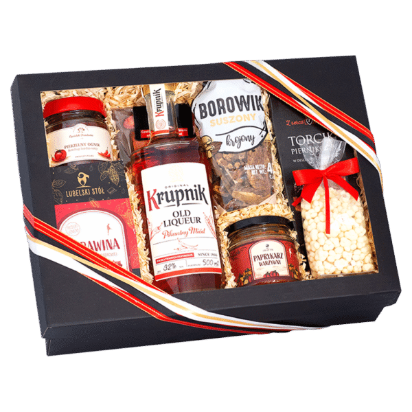 Zestaw Wigilijna Uczta to smakowita kompozycja inspirowana tradycją świątecznego stołu, idealna na prezent lub do własnego degustowania. Znajdziesz w nim likier Krupnik o smaku pikantnego miodu, torcik piernikowy w czekoladzie, suszone borowiki, żurawinę w czekoladzie oraz aromatyczne dodatki do potraw. To połączenie klasycznych, zimowych smaków z nutą słodyczy i pikantności, które wprowadzi świąteczny nastrój w każdym domu.