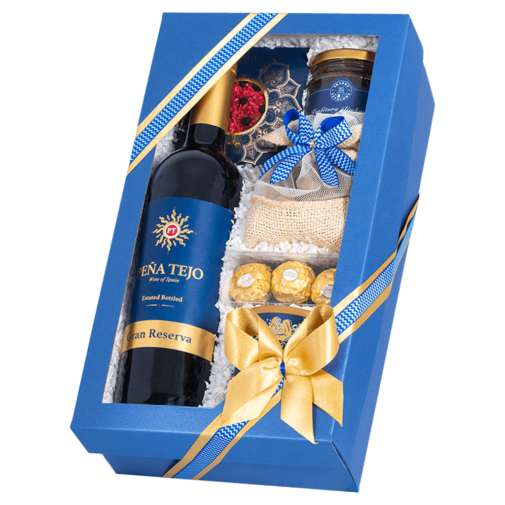 Zestaw Zorba to stylowy kosz prezentowy z hiszpańskim winem Pena Tejo Gran Reserva i wyselekcjonowanymi słodkościami. W środku znajdują się konfitura śliwkowa, orzechy laskowe, herbata liściasta oraz czekoladki i czekolada z malinami, które tworzą harmonijną kompozycję smaków. To doskonały prezent dla miłośników wina i eleganckich upominków.